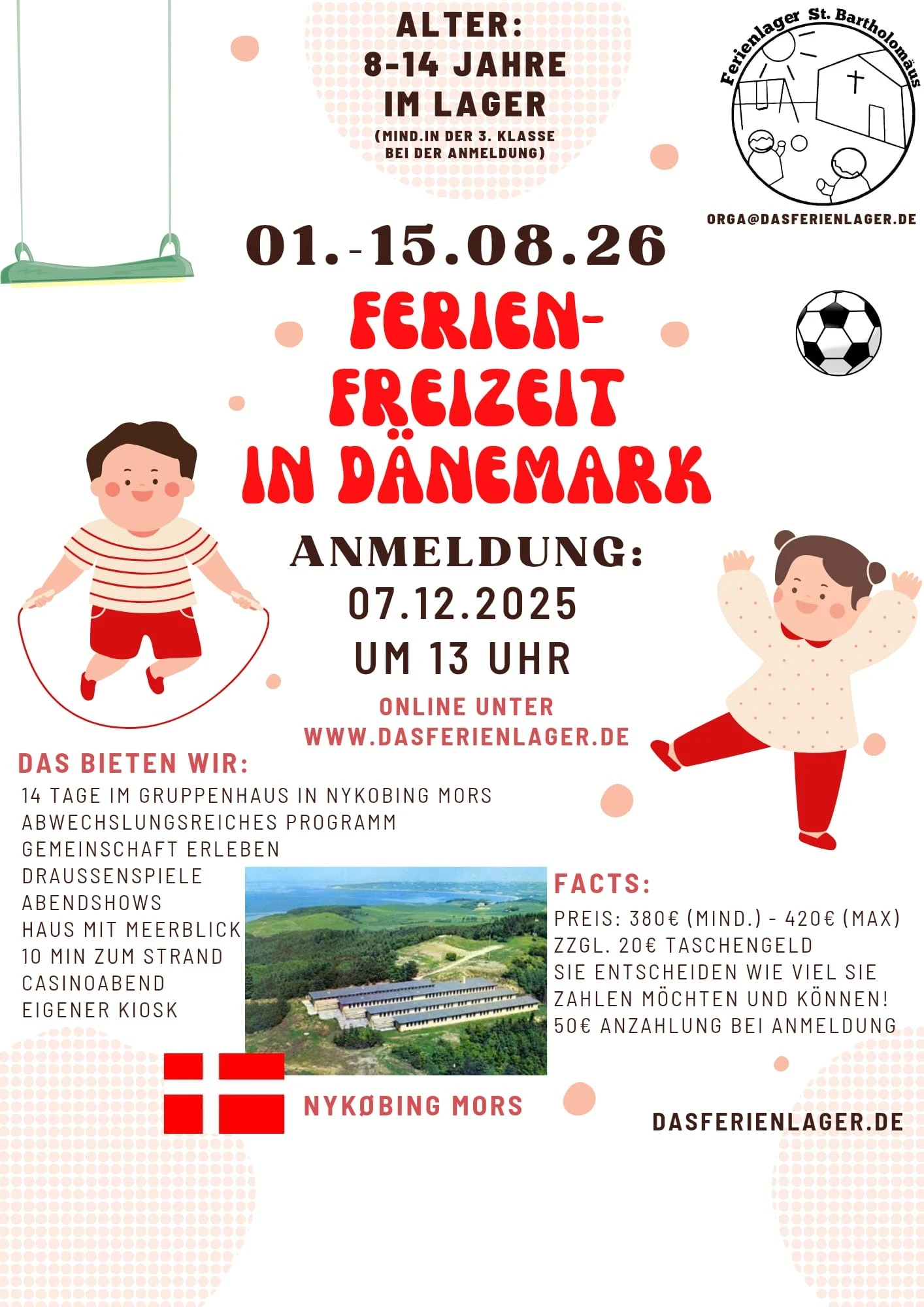 wir, das Team der Dänemark-Ferienfreizeit der Pfarrei St. Bartholomäus bietet auch im kommenden Jahr 2026 wieder eine Ferienfreizeit in den Sommerferien unter der Leitung von Jakob Gosda und Johannes Lange an. Zusammen mit einem motivierten Team aus Betreuerinnen, Betreuern und Küchenfeen geht die Fahrt in diesem Jahr nach Nykøbing Mors in Dänemark. Anmelden können sich alle Kinder, die sich bei der Anmeldung mindestens im 3. Schuljahr befinden, während der Freizeit zwischen 8 und 14 Jahre alt und die hygienischen Routinen im Alltag eigenständig bewerkstelligen können. Die Teilnahme ist unabhängig von Konfession, Religion oder weltanschaulichen Bekenntnis möglich.